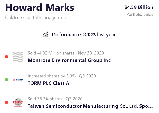 第十四位是Howard Marks。他是橡树资本的联合创始人兼董事长。2020年Howard Marks的总投资回报为8.18%。从持仓的行业分布来看,主要的行业是金融、日用品、交通业和电子科技,分别占比22.8%、19.6%、18.9%、15.4%。其中金融重仓企业有Ally金融、艾涛巴西联合银行、NMI;日用品重仓企业代表是宝洁;交通业重仓企业是TORM PLC和Star Bulk Carriers;电子科技重仓企业有台积电、英飞朗、超微电脑。