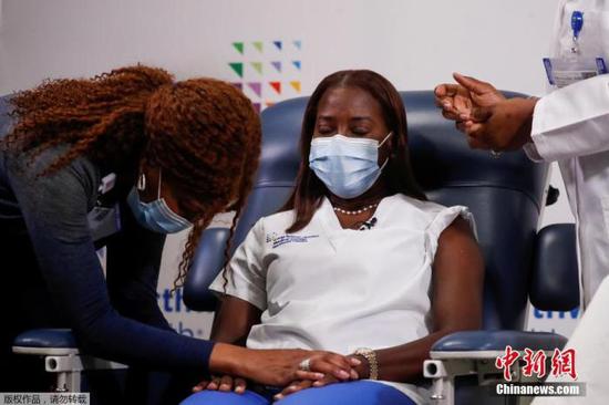 当地时间2021年1月4日,美国纽约,护士桑德拉·林赛在长岛犹太医院接种新冠病毒疫苗第二针。