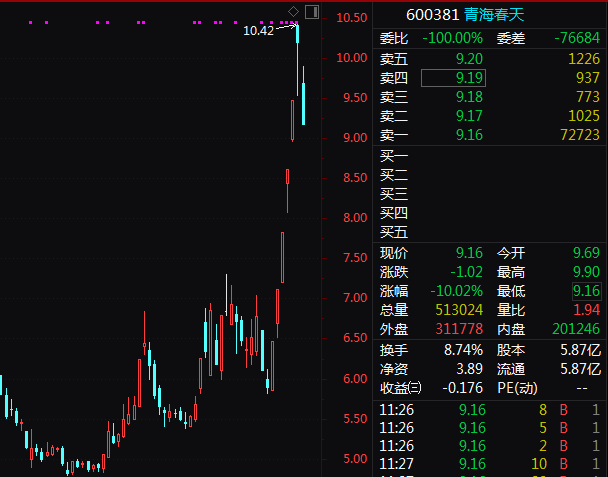 刚刚经历了5五个涨停板的青海春天(600381.SH)开盘即被封住跌停,上午收盘报9.16元。