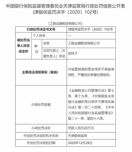 1月6日消息,天津银保监局公布的行政处罚信息公开表显示,工银金融租赁有限公司因违规开展尽职调查,严重违反审慎经营规则;租赁物权属调查、确权等管理工作存在严重不足,严重违反审慎经营规则;对监管核准的营业场所不具备使用权,严重违反审慎经营规则,合计被处罚款120万元。