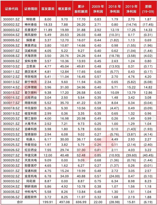 考虑到35家公司2009年以来通过IPO和增发募集了巨额资金,业绩却较10年前大幅下滑,更突显其基本面恶化之势。2009年上市的35家创业板2009年10月-12月通过IPO融资金额合计199.91亿元;2009年底,这35家公司的账面归属于母公司股东的净资产合计数为258.3亿元,由此可以推算,35家创业板公司IPO前账面净资产合计数约为58.39亿元(258.3-199.91)。2009年35家创业板公司净利润之和为22.0亿元,35家创业板公司IPO募资时间为2009年末, IPO募资对当年盈利影响甚微,因此,可以认为,这35家创业板公司2009年以58.39亿元净资产(含当年盈利)创造了22.0亿元的净利润。2009年35家公司通过IPO募集资金199.91亿元,2010年-2019年间35家公司通过增发股票募集资金497.08亿元。十年间,35家创业板公司累计股权融资696.99亿元!2019年末,账面净资产增至989.6亿元(大部分来源于股权融资),是2009年IPO前账面净资产58.39亿元的16.95倍!35家公司2019年净利润合计数15.8亿元,仅为2009年净利润22.0亿元的71.8%(详见表3);35家公司中17家公司2019年净利润低于2009年,其中,10家公司2019年发生亏损。