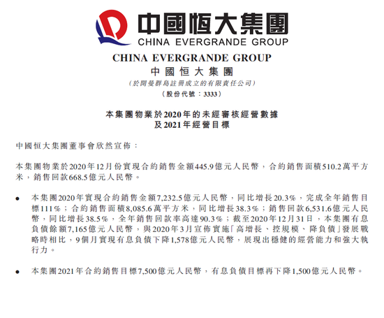 基于2020年的表现,恒大已制定出2021年目标,合约销售目标7500亿元,有息负债目标再下降1500亿元。