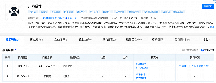 据天眼查APP信息显示,广汽蔚来于2018年4月10日成立,广汽集团与广汽新能源分别持股22.5%,蔚来汽车与蔚来基金分别持股22.5%,剩余10%股份由创始团队持有。接受此次融资前,广汽蔚来的融资进度停留在天使轮。