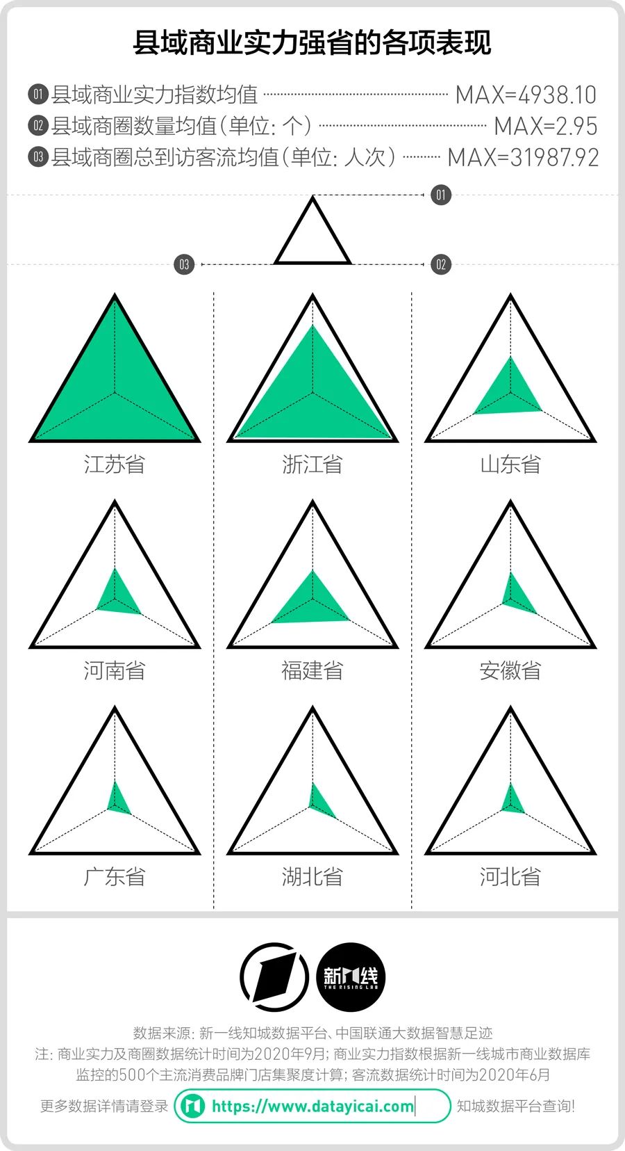 将各省所辖的县级城市在商业实力、商圈数量和到访客流上的情况各自平均,你就能够从下图的对比中明显看到江苏和浙江两省在县域经济中的明显领先优势。