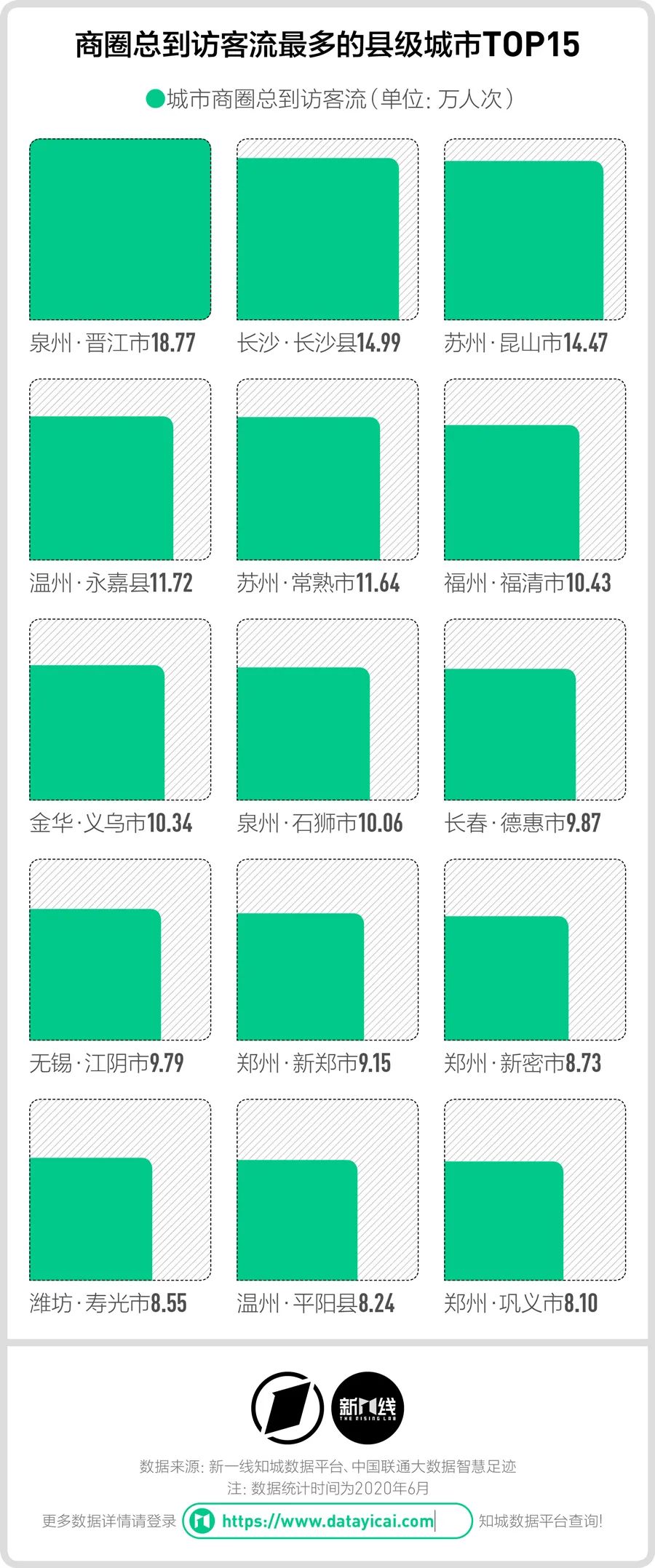 县级城市内商圈到访总客流最高的城市是泉州的晋江市,其次是长沙市的长沙县,然后才是昆山。在上图这份客流量最高的前15个城市的名单上,你会看到不少并不熟悉的城市名称。