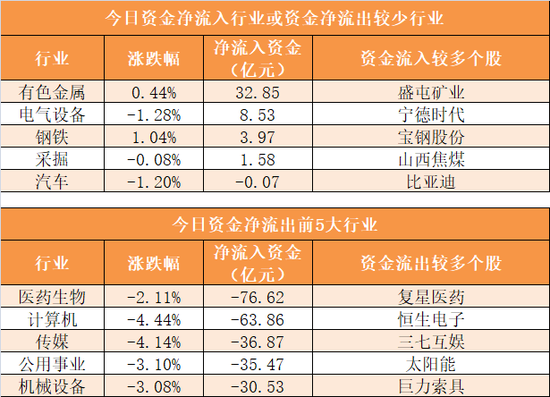 28个申万一级行业中,4个行业实现资金净流入,其中有色金属行业净流入32.85亿元居首。
