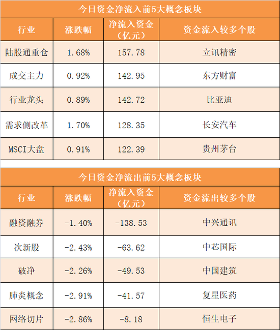 概念板块方面,今日陆股通重仓、成交主力、行业龙头、需求侧改革等概念板块资金呈现净流入,其中陆股通重仓概念净流入157.78亿元居首。