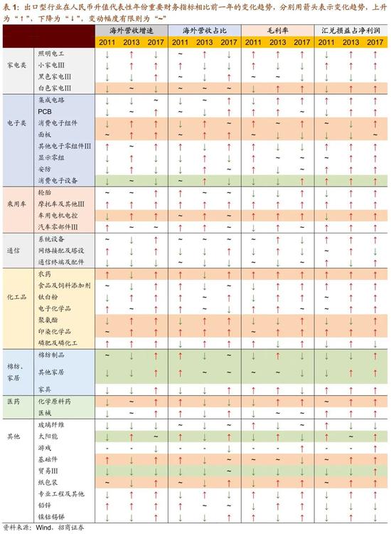 为了更好的衡量人民币升值阶段出口型行业的财务指标表现,本文考量人民币升值代表性年份(2011年、2013年和2017年)海外营收增速、海外营收占收入比例、毛利率、汇兑损失占净利润比例等指标相比前一年的变化趋势,分别用箭头表示变化趋势,上升为“↑”,下降为“↓”,变动幅度有限则为“~”。整体来看,海外营收指标变动幅度有限或扩张、毛利率较为稳定、汇兑损益占净利润比例可控的行业集中在白色家电、消费电子组件、化工品(农药、聚氨酯、印染化学品)、化学原料药、汽车零部件、基础件等,而以上指标表现相对较差的行业集中在贸易、太阳能、棉纺制品、其他家居等。