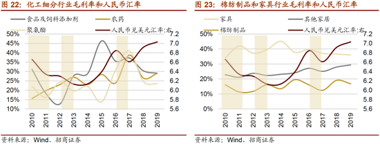 在人民币升值阶段,这些行业将会面临收入减少的困境,同时会面临丢掉订单(转移至其他国家)的压力,这时不得不去采用降价策略来保住一定的市场份额,如棉纺制品、其他家居、面板、太阳能、基础件、贸易等行业。若维持价格稳定或者降价策略效果欠佳,企业产能利用率将会下降或者落入“量价齐跌”的模式中,那么毛利率和净利率等盈利指标均会出现明显恶化,如在2011年人民币持续升值阶段太阳能、贸易等行业发生了类似的情形,但在2013年和2017年发生类似情形的行业极少。