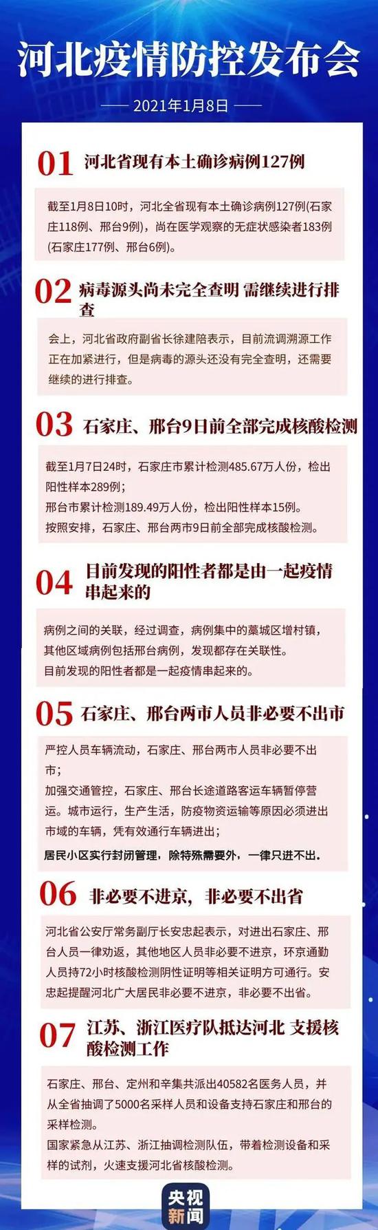 据发布会上通报,从1月2日至8日10时,河北省共有本土确诊病例127例,其中石家庄118例,邢台9例。尚在医学观察的无症状感染者183例,其中石家庄177例,邢台6例。
