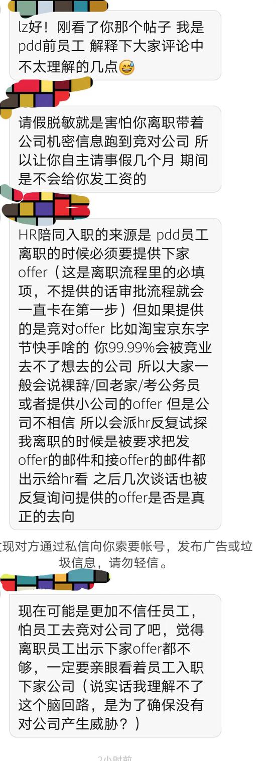 你说在PDD这样的公司工作,还有人权吗?手机都可以被随意翻看。还有一位打算离开PDD的员工爆料,他需要提供下家的offer给PDD才能走离职手续,而且更骚的是入职下家公司的时候,PDD的HR将陪同入职。