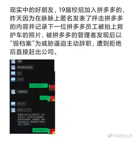 PDD有位员工因在网上发布同事被抬上救护车的照片,被管理层逼迫主动辞职、赶出公司。