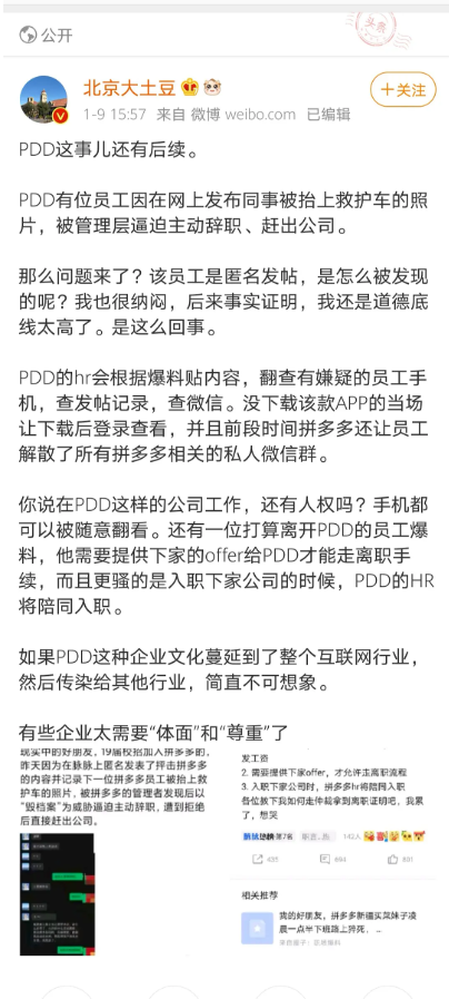 PDD的hr会根据爆料贴内容,翻查有嫌疑的员工手机,查发帖记录,查微信。没下载该款APP的当场让下载后登录查看,并且前段时间拼多多还让员工解散了所有拼多多相关的私人微信群。