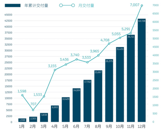 当年2月份,蔚来就获得了合肥市的100亿元融资大礼。在充足的资金加持下,蔚来旗下汽车销量持续猛增,2020年4月份至12月份,蔚来连续9个月销量同比翻番。