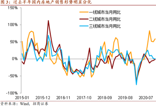 去年下半年以来,房地产销售形势出现明显分化。这体现在两方面:其一,从销售增速水平看,一线城市明显领先二三线城市,过去半年1线城市销量同比平均增速未49.8%,而二线和三线城市的平均增速仅为-2.8%和10.7%;其二,从销售增速的趋势看,二线城市降幅持续收窄,三线城市增速持续放缓,一线城市冲高回落。二线城市销售形势对全国房地产销售影响程度最高,2020年二线城市房地产销售占比为45.3%。过去半年,二线城市销售增速降幅显著收窄,从9月的-12%收窄至12月的-1.3%,而且12月一线城市销售增速又反弹至58.8%。因此,尽管三线城市销量增速快速下滑,但12月全国房地产销售形势将延续改善势头。
