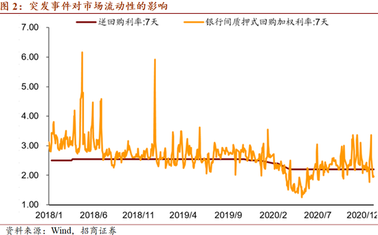 永煤事件后,资金利率一直处于比较宽松的状态。但我们认为这并不代表央行的态度转向,更可能的是对冲永煤违约对市场流动性的影响。回溯过去两年,银行间质押回购加权利率一共有3个时段显著低于逆回购利率,而这三个时段都是有突发事件发生,分别是2019年6-7月的包商事件、2020年2-4月的新冠疫情和2020年11-12月的永煤事件。当突发事态缓解后,货币市场加权利率均会有回归。