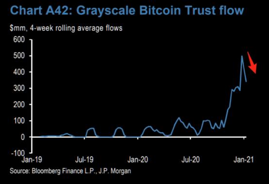 摩根大通警告,如果流入“灰度信托”的资金数量大幅放缓,比特币回调的概率将大增,出现类似2019年的大幅回调将不可避免。