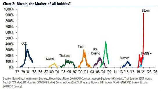 美国银行在周末的报告中将比特币形容为最近几十年来全球的“资产泡沫之母”。该行的分析师哈内特(Michael Hartnett)在报告中写道: