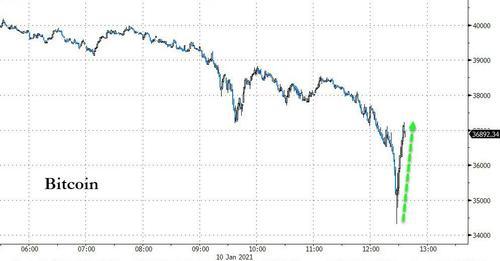截止11日凌晨4:30,比特币日内狂跌近6000美元,最低至34322美元/枚。随后数分钟内,比特币又短线拉升逾1500美元,截止发稿回升至38000美元/枚附近,日跌幅收窄至5.5%。
