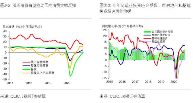 我们预计2021年就业市场和居民收入增长将进一步改善,随着经济复苏和疫情持续受控,消费者信心也将改善,尤其是在更大范围接种疫苗之后。再加上2020年基数较低,我们预计2021年消费实际增长10%,且服务消费的反弹更为显著(如餐饮、旅游、线下娱乐等)。另一方面,政策支持减弱可能导致房地产和基建投资放缓、并抵消制造业资本支出的反弹,因此预计固定资产投资增长会弱于消费。