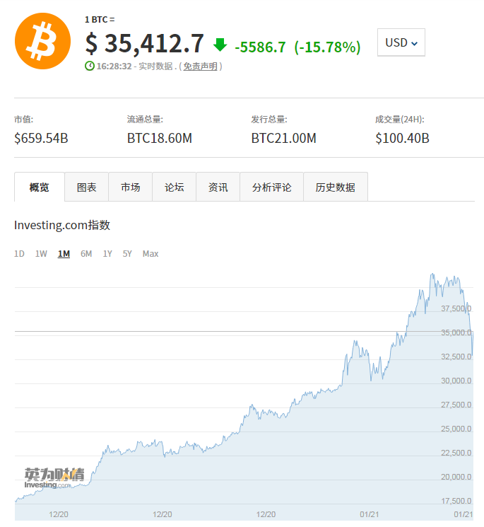第三,比特币狂跌。这一波A股市场的抱团资产起涨时点几乎跟比特币一样。该投资品种,从12月12日左右突然爆发,从18000美元左右水平,一路狂飙至40000美元以上水平。而在此期间,A股市场的抱团股也开始持续走强。但近几个交易日,比特币开始持续杀跌,截至发稿时间,跌幅接近16%。