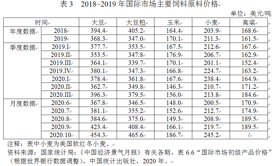 整理2018~2020年10月国际市场大豆、大豆粕、玉米、小麦、高粱价格数据,包括2018、2019年度均价,2019年一季度至2020年三季度7个季度的季度均价,以及2020年6~10月的5个月度均价。从中可以看出,自2020年第二季度低点以来,国际市场上大豆、大豆粕、玉米、小麦、高粱价格全部趋向上涨,且价格上涨呈加速趋势。其中,大豆、大豆粕自9月起月度均价超过此前高点2018年度均价,玉米自10月起月度均价超过此前高点2019年二季度季度均价,小麦自10月起月度均价超过此前高点一季度季度均价,高粱自二季度起季度、月度均价均超过此前高点2018年度均价。