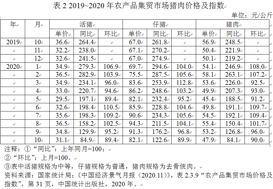 考察农产品集贸市场活猪(中等规格)、仔猪(普通规格)和猪肉(去骨统肉)单价及其同比、环比变动,这三种产品价格环比均从2020年9月开始连续下降,但活猪、猪肉价格自10月起同比下降,仔猪价格10月同比仍保持上涨状态。作为成品的活猪、猪肉价格下行,作为关键投入品的仔猪价格仍居高不下,至少是价格下跌滞后,养猪业利润空间压缩的风险正趋向凸显。