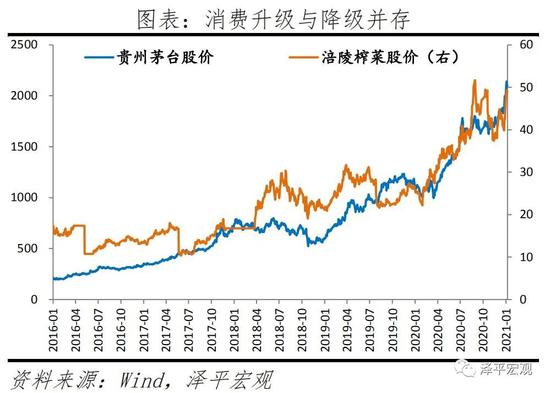 2020年疫情冲击下,结构性问题更加凸显,通胀主要表现为资产通胀,底层通缩与上层通胀并存,消费升级与消费降级并存。以汽车为例,2020年乘用车零售销量负增长,但高档车销量高速增长,市场份额不断上升。1-11月乘用车累计同比增速-8.3%;其中,30万以下的中低档车累计同比增速-10.2%;而30万以上高档车销量累计同比增速14%,市场份额由2019年的7%上升至9.7%。