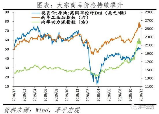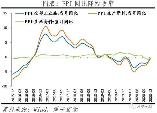 PPI上行主因工业生产持续向好,出口和投资恢复,以及国际大宗商品价格拉动。12月布伦特原油均价环比16.8%,南华工业品指数环比10.4%,南华焦煤指数环比25.8%,南华动力煤指数环比25.3%,南华螺纹钢环比14.4%,LME铜环比9.8%。