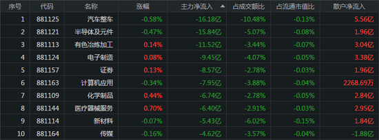 主力资金流出的板块分别是汽车整车、半导体及元件、有色冶炼加工,主力资金流出金额分别为16.18亿元、15.84亿元、11.52亿元,其中散户净流入金额为5.56亿元、1.96亿元、3.04亿元。