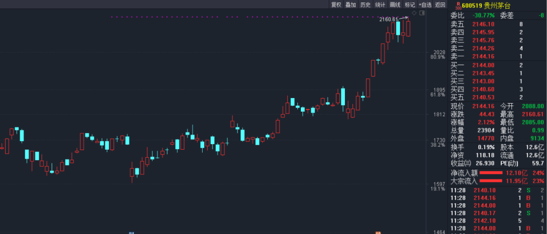 今日上午,白酒板块继续大涨,贵州茅台上涨2.12%,报2144.16元,盘中再创历史新高。