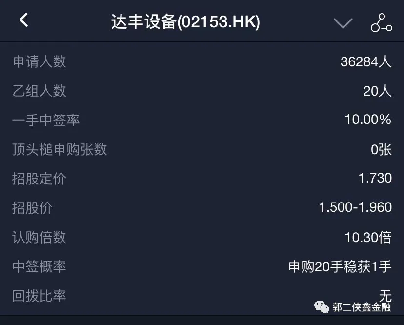 申购人数36284人,最终超额认购10.3倍,无回拨,无顶头槌,一手中签率10%,申购20手稳中一手。本次招股价区间为1.5~1.96港元,最终以中位数定价1.73港元,每手3460港元。