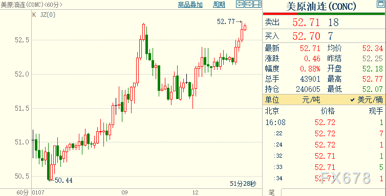 北京时间16:08,NYMEX原油期货上涨0.88%至52.73美元/桶;ICE