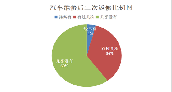 调查还涉及到返修问题。调查统计,有超过三成的受访车主表示自己的汽车有过二次返修的情况。其中“经常有”占4%;“有过几次”的占36%,“几乎没有”占60%。