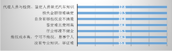 消费者维权遇到的主要障碍是:“举证难”,占55.6%;“维权成本高”,占34.3%;“行业标准不健全”,占35.1%;“鉴定难且费用高”占34.8%;消费者“不清楚自身权益”占26.8%;“损失金额很难确定”占20.5%等。
