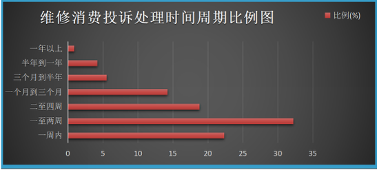 在汽车维修投诉纠纷方面,调查显示,从商家受理投诉到妥善处理,“一周内”解决的占22.3%,“一至两周”的占32.2%,两者合计占55.5%。