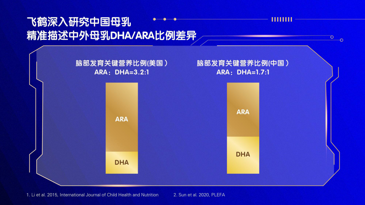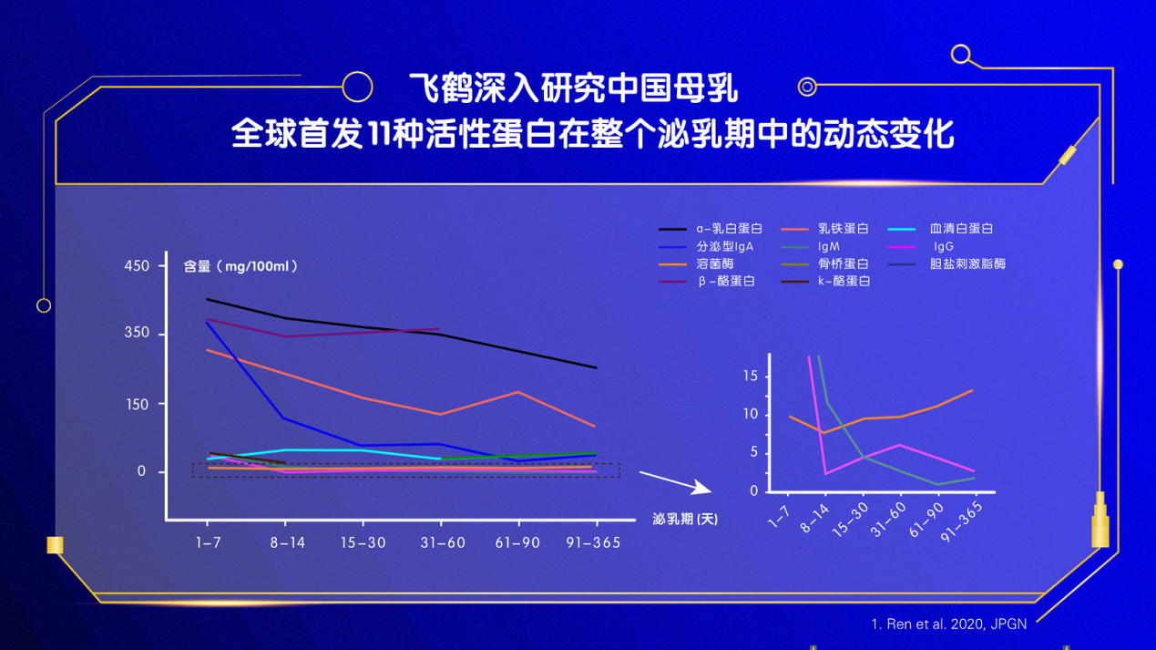 中国飞鹤创新中心高级总监蒋士龙公布飞鹤母乳科研成果现场,飞鹤首席科学家、研发负责人蒋士龙介绍道,通过对中国母乳的持续研究,2020年1月,飞鹤在国际儿科权威杂志JPGN上发表了针对中国母乳蛋白质和氨基酸的系统综述,这是首篇被纳入国内外研究的成果,揭示了18种氨基酸在9个母乳阶段的动态变化;10月,在国际脂肪酸研究学会官方杂志上发表研究成果,首次通过系统综述,研究中国不同地区之间母乳42种脂肪酸含量的特点,发现中国母乳三大类脂肪酸关键比例为1: 1: 0.7, 并更加精准地描述了脑部发育重要营养物质DHA/ARA的比例为1: 1.69;12月,飞鹤又在食品营养领域专业杂志上发表成果,在蛋白质研究成果的基础上,揭示了中国母乳中11种活性蛋白成分在6个母乳阶段的变化,其中包括乳铁蛋白、α-乳白蛋白等关键营养成分。