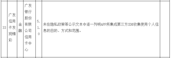 金融类App广发信用卡发现精彩(5.1.0版本)存在以下侵害用户权益的问题:未在隐私政策等公示文本中逐一列明APP所集成第三方SDK收集使用个人信息的目的、方式和范围。