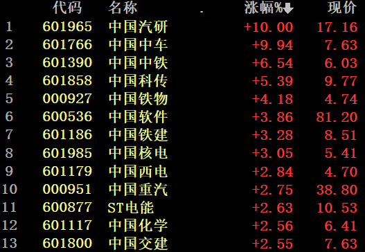 今日部分涨幅居前的中字头个股