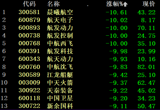 国防军工板块调整幅度也较大,航天电子、航发动力、航发控制等多只个股跌停。