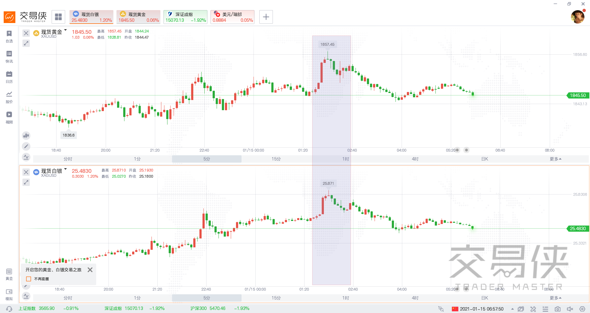 现货金银在鲍威尔讲话期间短线上涨,讲话结束后一度转跌,美股收盘前重新转涨,日内最高涨0.7%,日高站上1857美元。现货白银一度涨2.6%,随后维持超1%的涨幅,站稳25美元上方。