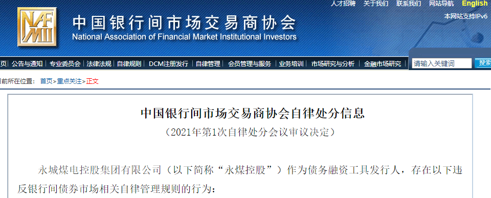 1月14日,中国银行间市场交易商协会公布新年“首罚”,对永煤控股予以公开谴责,暂停其债务融资工具相关业务1年;对河南能化予以严重警告,暂停其债务融资工具相关业务7个月。