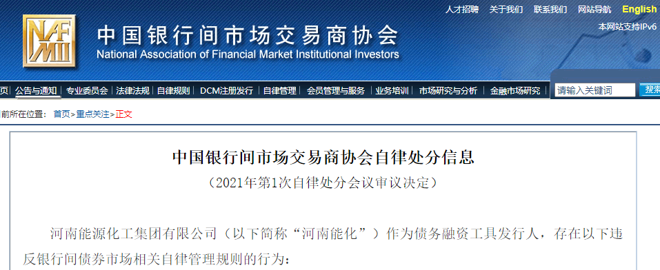 交易商协会表示,对河南能化予以严重警告,暂停其债务融资工具相关业务7个月;责令其针对本次事件中暴露出的问题进行全面深入的整改;责令其在银行间债券市场信息披露平台进行公开致歉;对公司时任董事长刘银志予以警告。