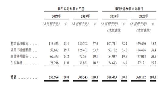 公司的大部分收入来自物业管理服务,于2018年及2019年以及截至2019年及2020年9月30日止九个月分别为1.164亿元、1.407亿元、1.077亿元及1.295亿元,分别占同期总收入的45.1%、 37.0%、38.4%及35.2%。