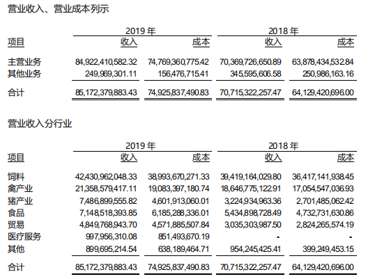 在全国工商联披露的2020年中国民营企业500强中,新希望集团位列第27位。根据新希望集团2019年年报,当年公司851.72亿元。其中来自饲料、禽产业、猪产业的收入分别达424.31亿元、215.59亿元和74.87亿元。