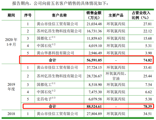 环洋股份的客户主要为环氧树脂生产厂商及化工产品贸易商,客户相对集中。报告期内,公司前五大客户销售收入占当期销售收入的比例分别为74.91%、83.10%、78.39%和74.82%。