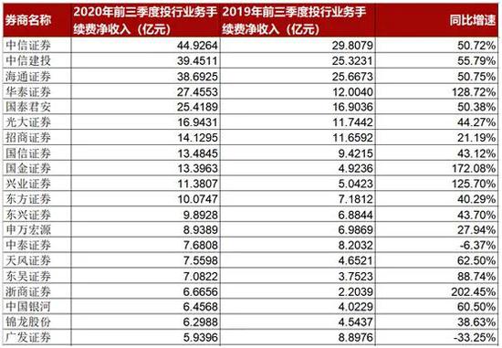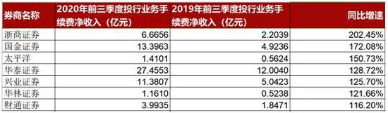 此外,据Choice数据统计,2020年前三季度,浙商证券、国金证券、太平洋、华泰证券、兴业证券、华林证券、财通证券等券商的投行业务手续费净收入的同比增速超过了100%。