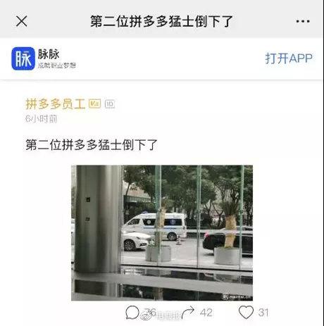 1月7日,拼多多员工在脉脉发言:“第二位拼多多猛士倒下了”,并配了一张救护车的图。