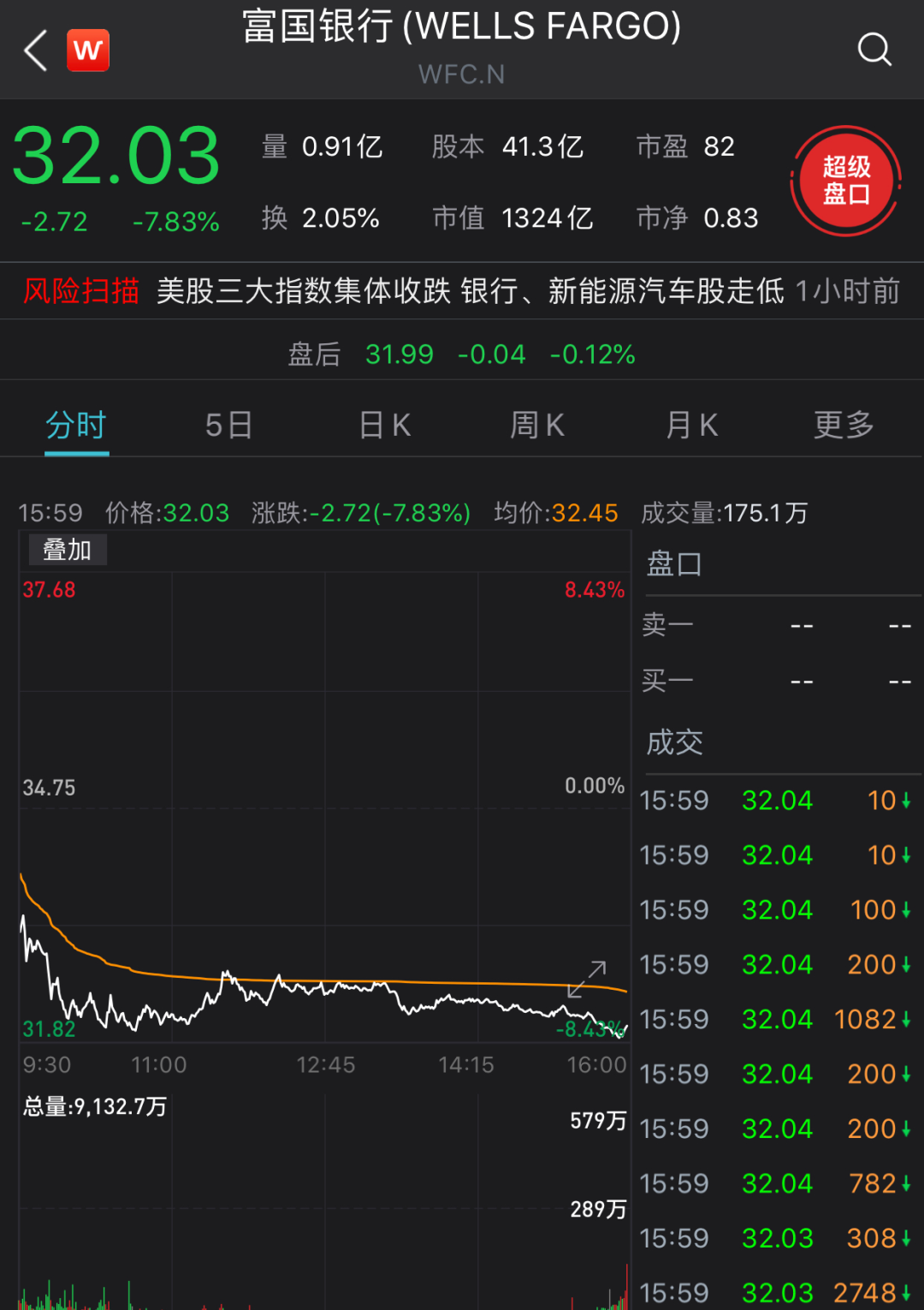 主要银行股全线走低,摩根大通跌1.63%,高盛集团跌2.18%,花旗集团跌6.90%,摩根士丹利跌1.63%,美国银行跌2.85%,富国银行跌7.83%。