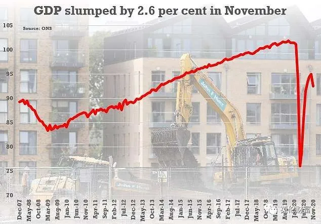 英国国家统计局(ONS)今天的最新数据,受到冬季防疫的全英封锁冲击,2020年11月份英国经济总量下滑2.6%,GDP比疫情前的峰值低8.5%。